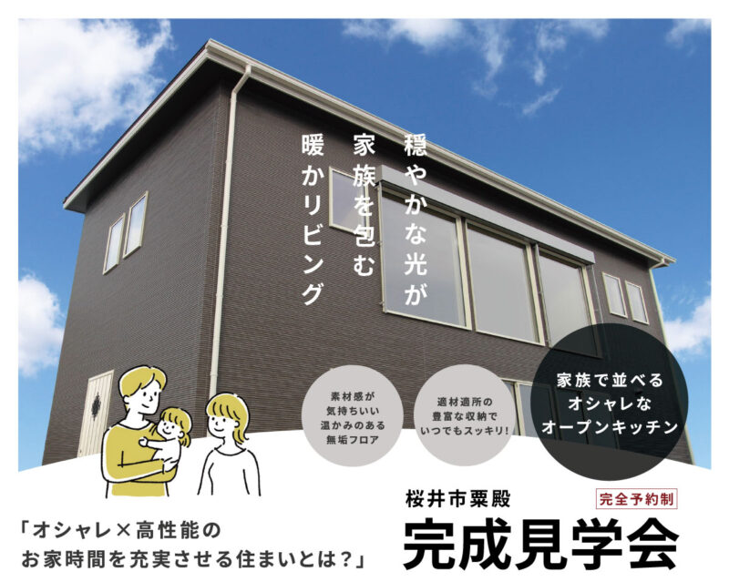 桜井市に完成したA様邸は、耐震等級3+パッシブデザインにより、地震に強く一年中快適に過ごせる省エネ住宅です。玄関ホールのハイドアを開けると、吹き抜けと大きな窓から光が降り注ぐ開放的なリビングが広がり、お子様ものびのびと過ごせます。キッチンは高級感あるグラフテクトのペニンシュラ型で、家族で一緒に調理を楽しめるレイアウト。隣の和室は、おむつ替えや遊び場、看病スペースとしても便利です。洗面室兼ランドリールームは物干し付きで、2階への動線もスムーズ。各居室と大容量WIC2つに加え、広いホールでは読書やひなたぼっこも。白と木目を基調に、くすみカラーをアクセントにしたおしゃれな仕上がりです。ご夫婦の理想を叶えた家族の暮らしを見守るお家は、今回2日間限定の公開です。ぜひこの機会にご体感ください。